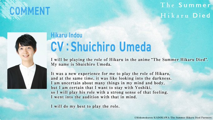 Shuichiro Umeda who voices Hikaru Indou released an official comment regarding their role in The Summer Hikaru Died anime adaptation: