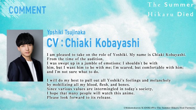 Chiaki Kobayashi who voices Yoshiki Tsujinaka released an official comment regarding their role in The Summer Hikaru Died anime adaptation: